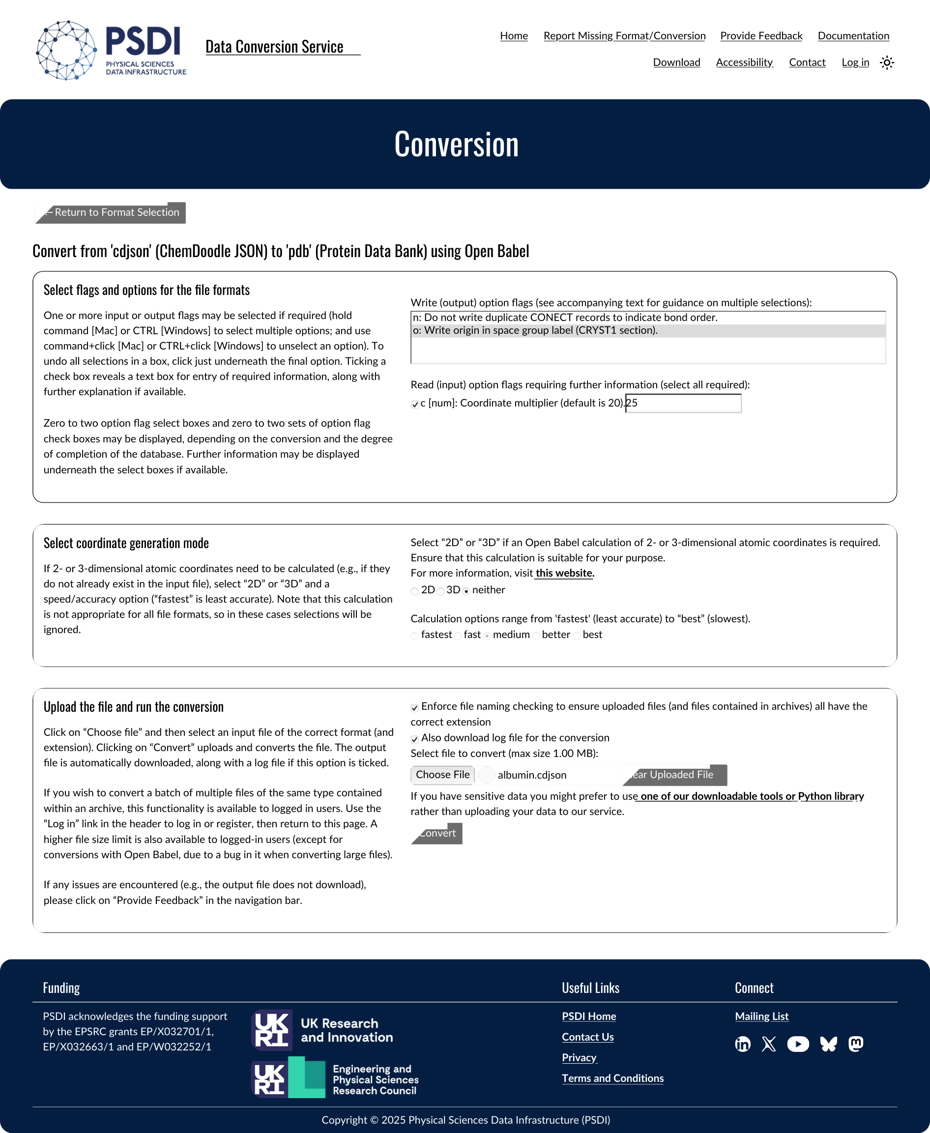 Alongside this, there is clear scope for closer integration between the Data Conversion Service and other PSDI tools and services, for example by enabling data transformed through the Data Revival Service (a service which takes scanned handwritten paper lab notebooks and converts them into machine-readable data) to be converted into a wider range of usable formats, or by generating chemical identifiers such as InChI or SMILES from a broader set of input formats for use in discovery services like Cross Data Search.